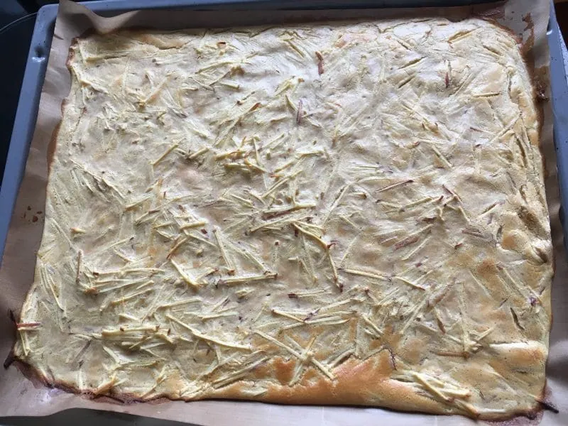 • Wenn der Backofen die Temperatur erreicht hat, Pfannkuchenteig auf das heiße Backblech gießen und gleichmäßig verteilen
