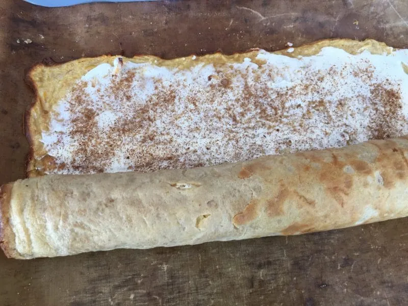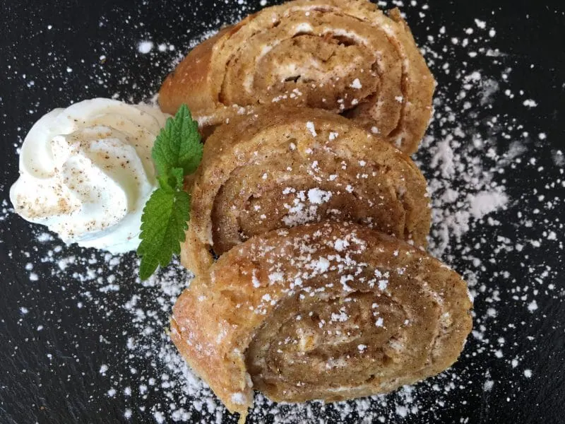 • Pfannkuchen von der breiten Seite zu einer Rolle aufwickeln und in ca. 2 cm dicke Scheiben schneiden