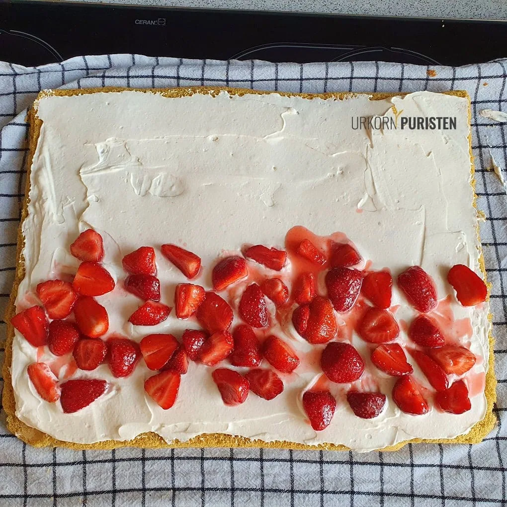 • Die Erdbeeren auf einer Hälfte verteilen und von dieser Seite aus aufrollen.