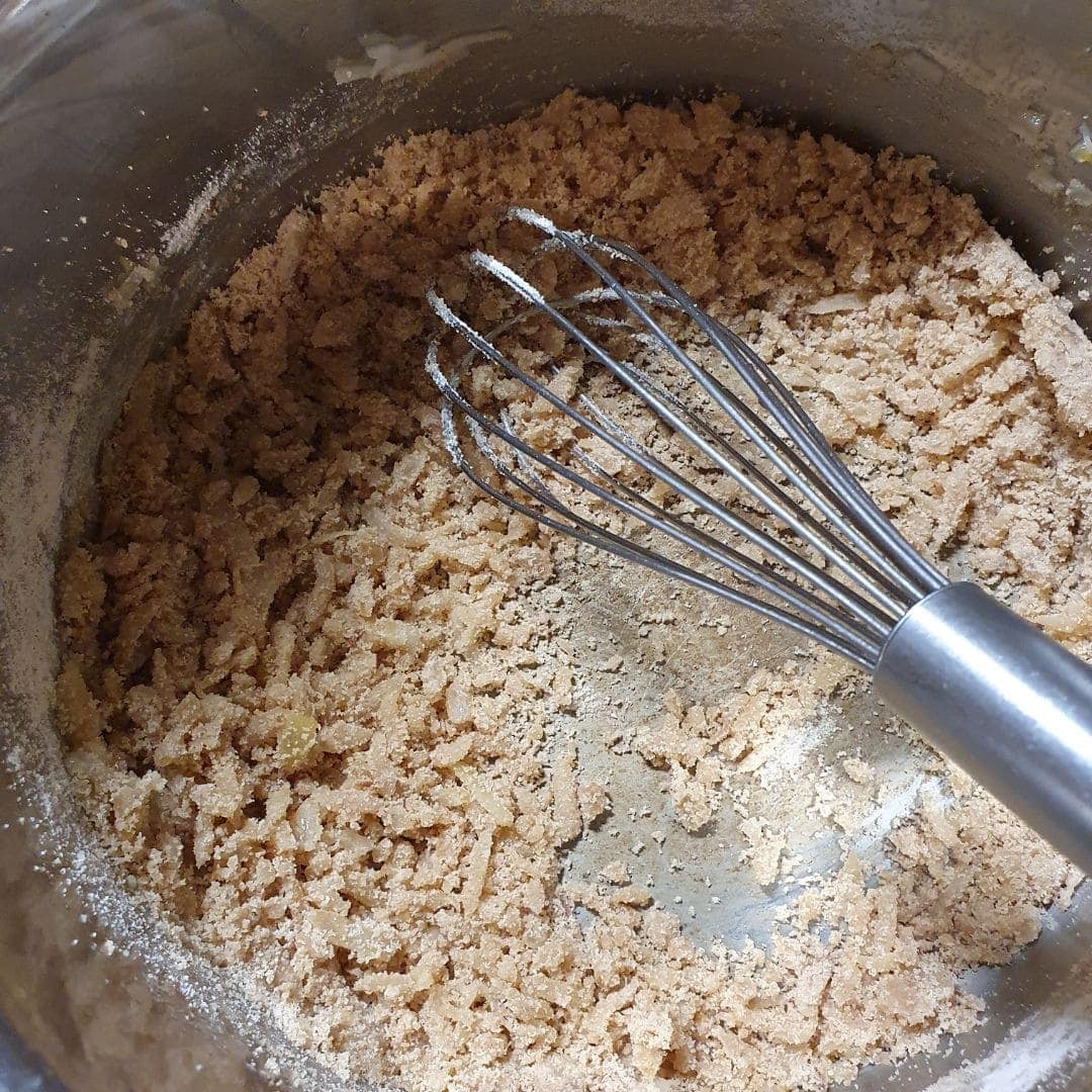 - Das Vollkornmehl in den Topf geben und gut umrühren, bis eine gleichmäßige Masse entsteht. Dabei darauf achten, dass das Mehl nicht anbrennt.