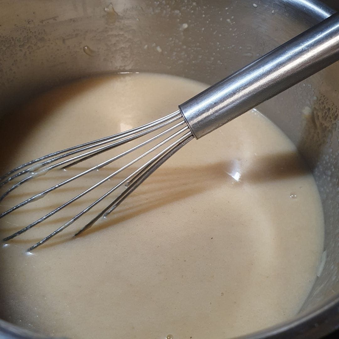 - Nach und nach die Gemüsebrühe unter ständigem Rühren, schubweise hinzufügen und immer wieder einkochen lassen, um Klumpen zu vermeiden.