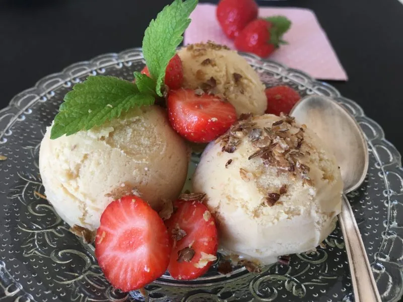 • übrigens – wenn du dich, wie ich an weniger Zucker gewöhnt hast, kannst du den Zucker auf 100 – 120g reduzieren. Für meinen Geschmack war das Eis etwas zu süß…