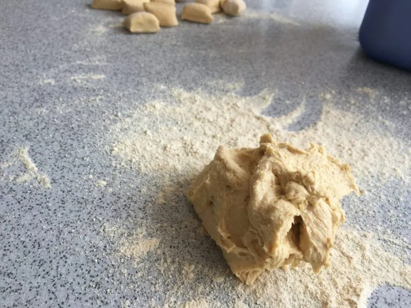 - Die Teigstücke mit Mehl bestäuben und jeweils zu einem ca. 5 cm dicken Strang rollen