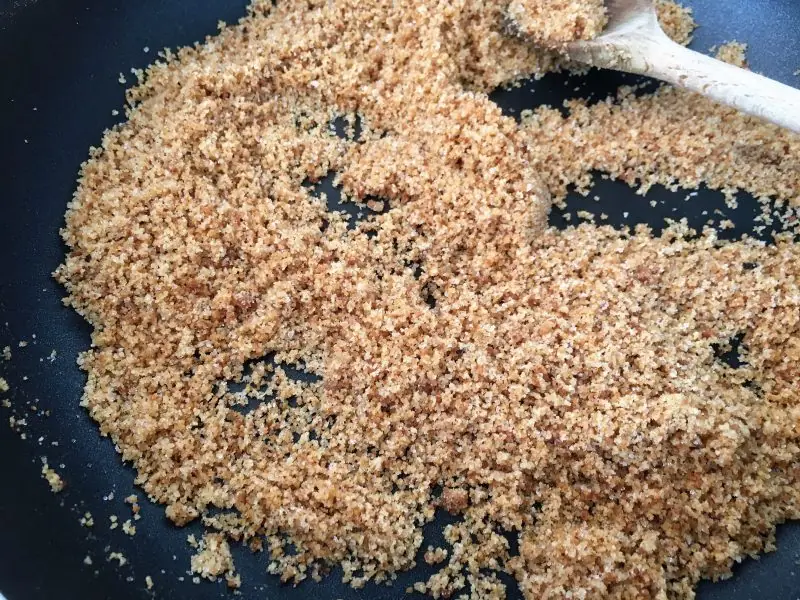 - 100 g Brotbrösel in die Pfanne geben und bei mittlerer Hitze hellbraun anrösten