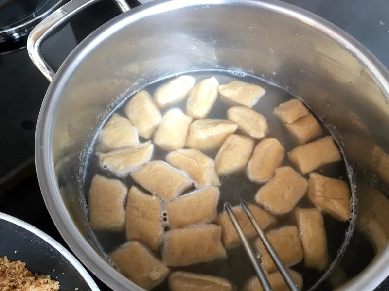 - ca. 3 Liter Wasser in einem Topf zum kochen bringen und die Nockerl ins Wasser geben