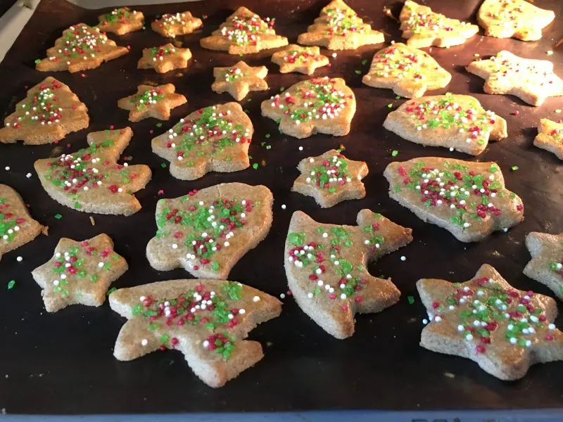 (wenn der Teig aufgebraucht ist, die andere Hälfte aus dem Kühlschrank holen) - Formen ausstechen und die Teiglinge auf eine mit Backpapier ausgelegtes Backblech legen