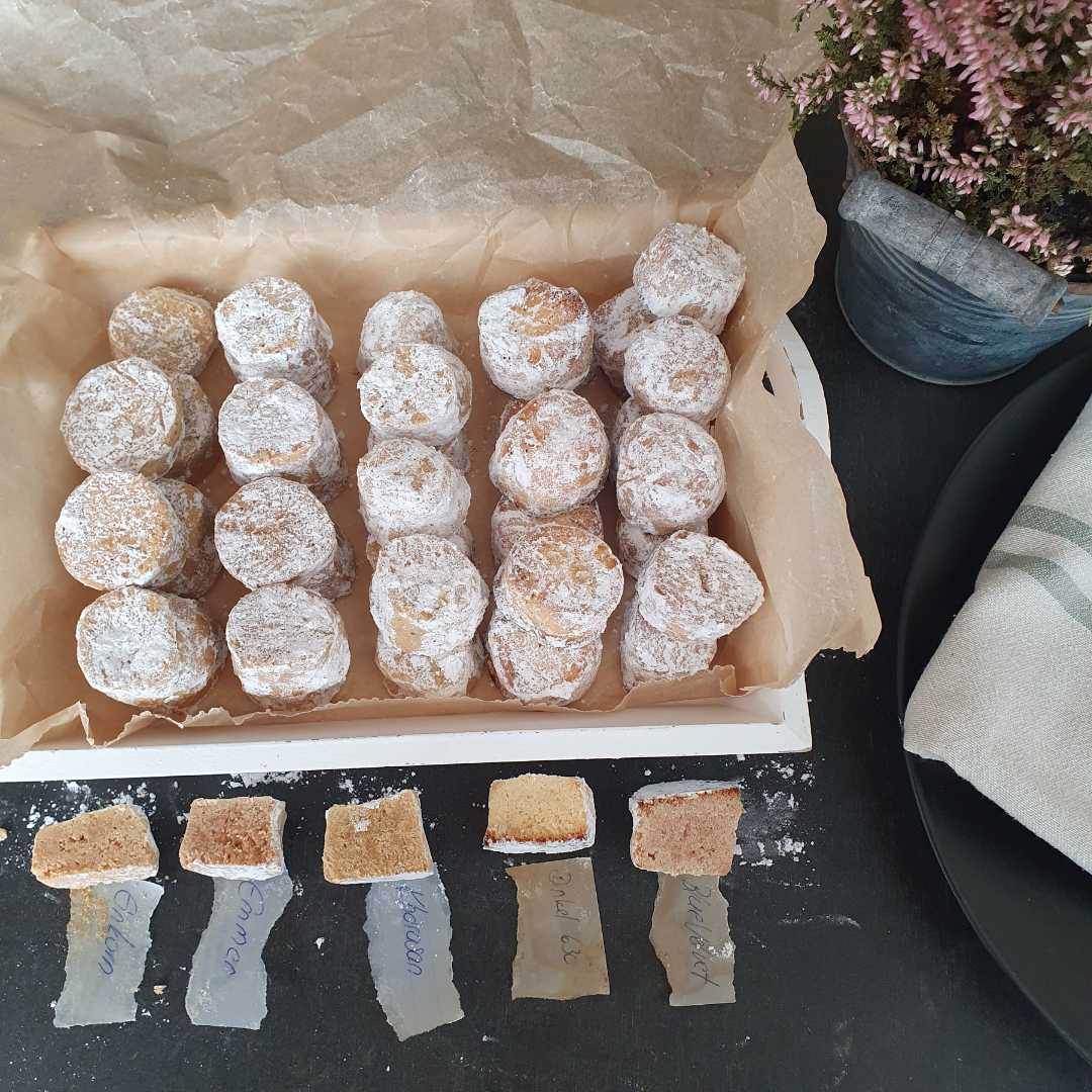 - Den Puderzucker mit Vanillezucker mischen und die noch warmen Kekse darin wälzen