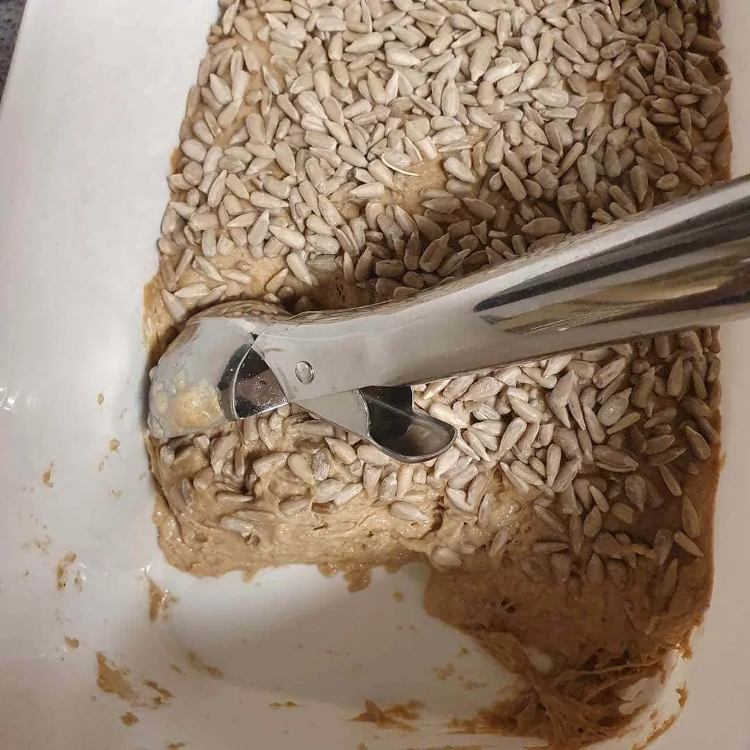 - die Teigoberfläche mit Sonnenblumenkerne üppig bestreuen