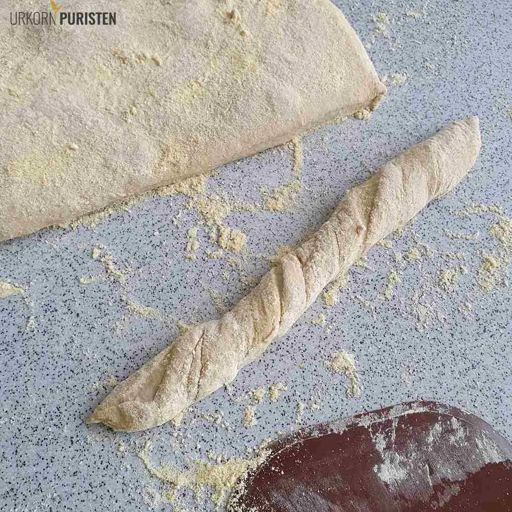- Auf ein mit Backpapier belegtes Backblech legen und die Teigstränge dabei mehrfache in sich verdrehen