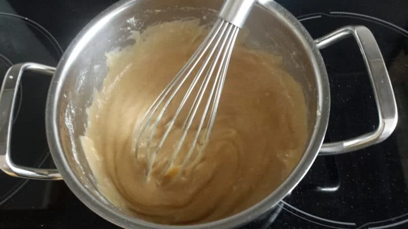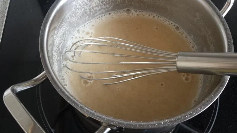 - 50 g Mehl mit 250ml kaltem Wasser klümpchenfrei in einem Kochtopf verrühren