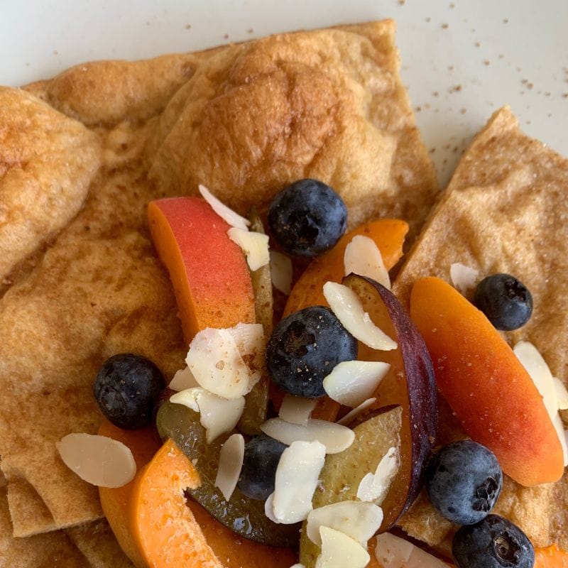 6. Frühstücks-Variante: Dünn mit Quark bestreichen, frisches Obst darauf verteilen und in quadratische Stücke schneiden oder aufrollen