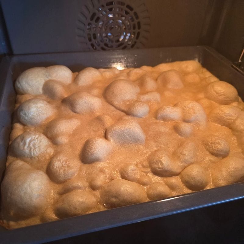7. Im vorgeheizten Ofen 20 Minuten backen. Keine Sorge, die großen Luftblasen im Teig sind genau richtig.
