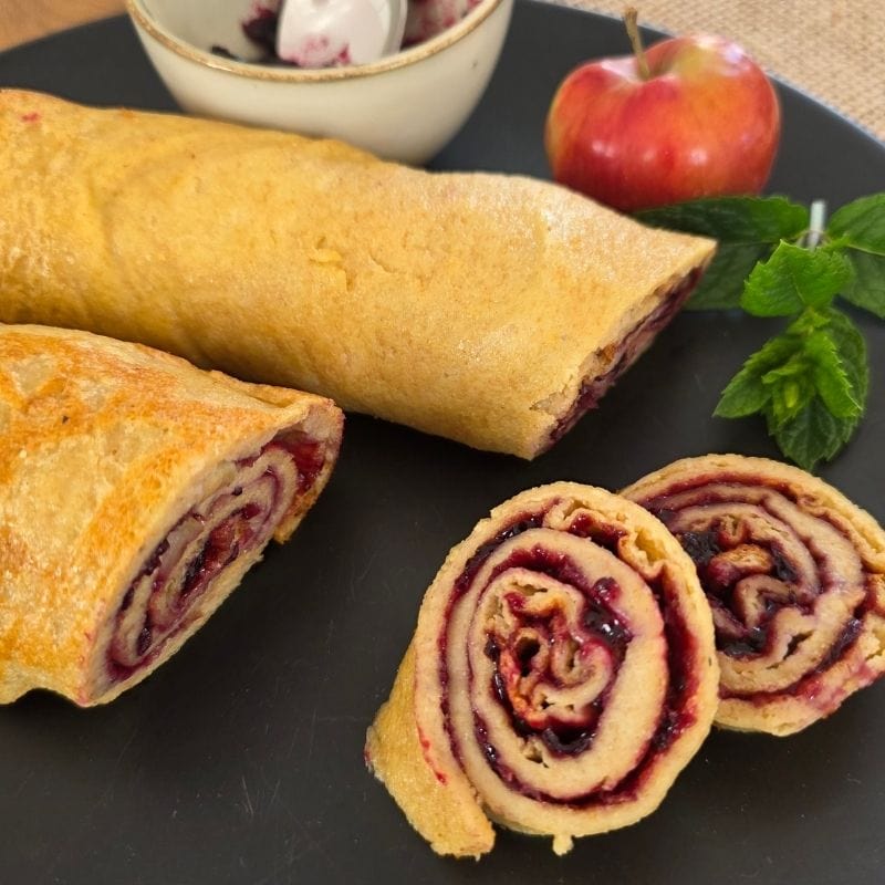 1. Marmelade: 2 EL säuerliche Marmelade am dem Pfannkuchenfladen verteilen. Aufrollen und in Scheiben schneiden
