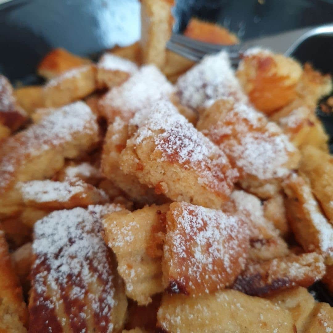 - Quarkschmarrn mit Emmer servierfertig in einer schwarzen Pfanne
