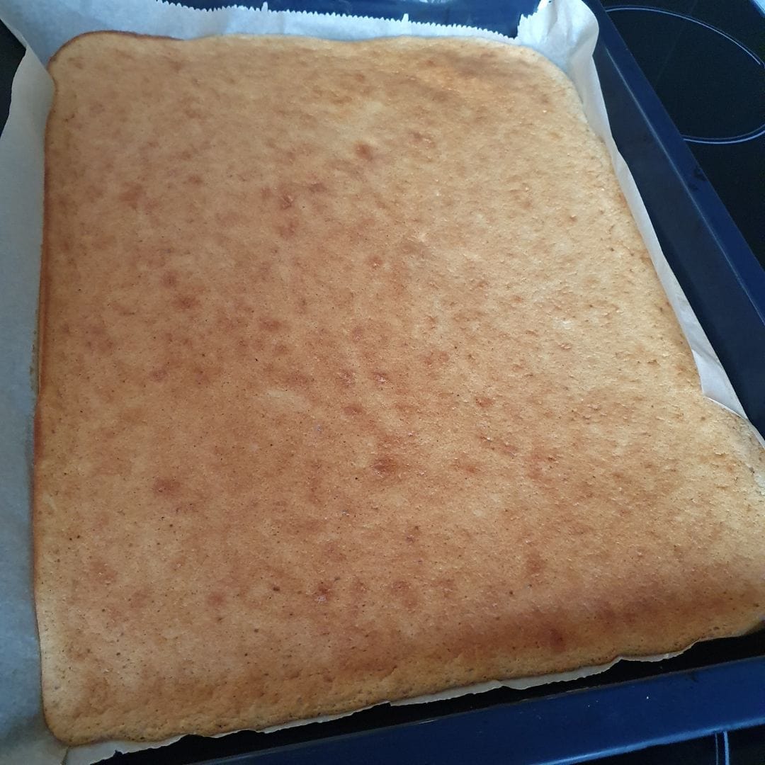 - Den Teig auf ein mit Backpapier ausgelegtes Backblech gießen und gleichmäßig verteilen.