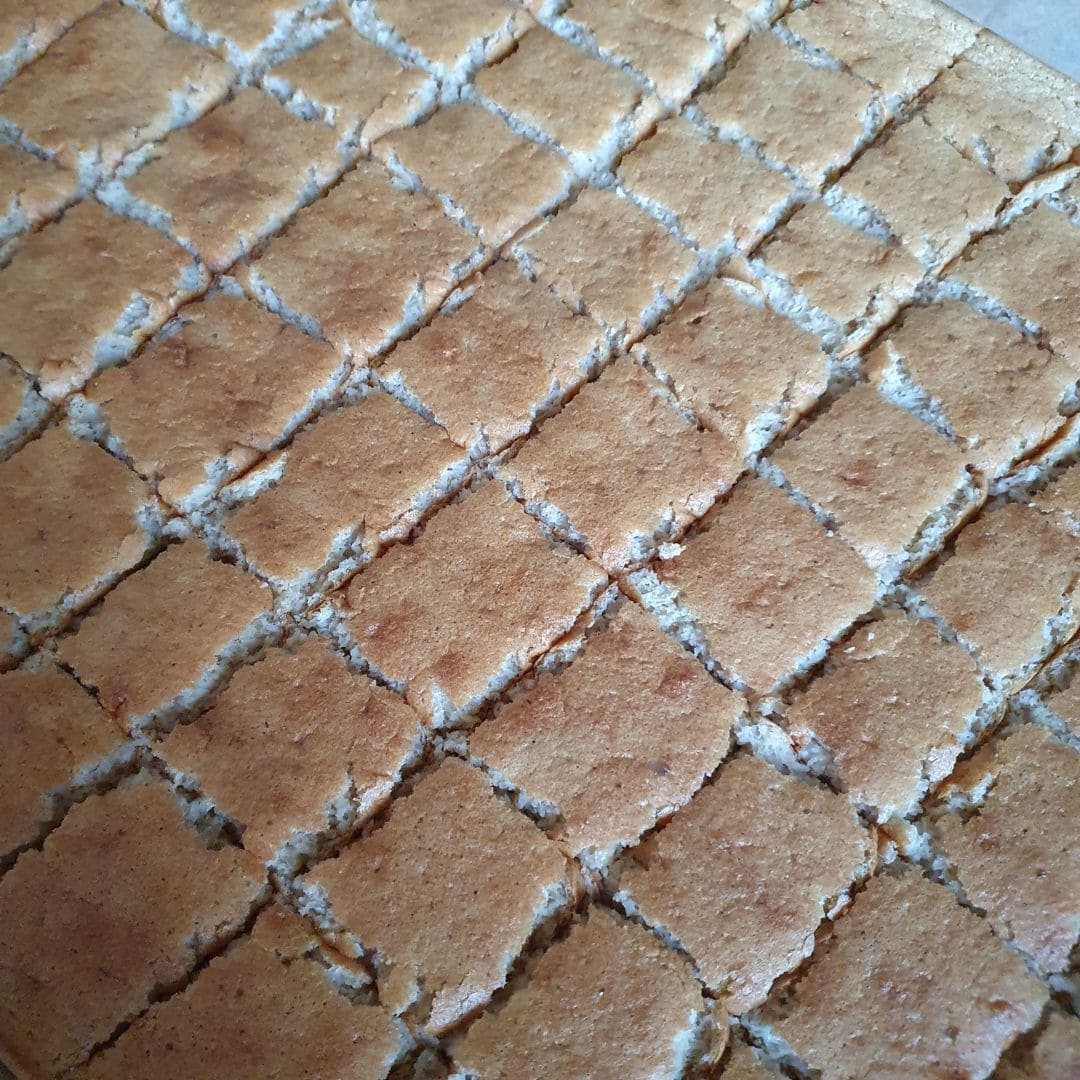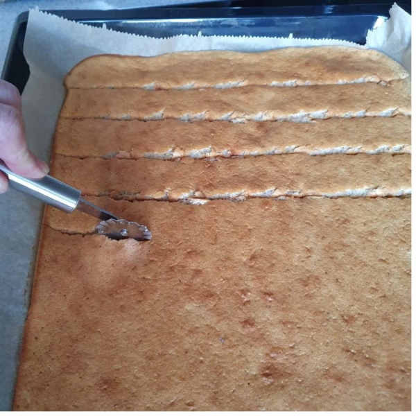 - Den gebackenen Teig mit einem Backrad oder Pizzaschneider in kleine Ecken schneiden.