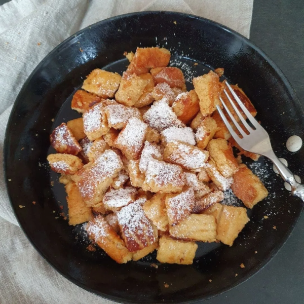 - Den gebratenen Quarkschmarrn auf Teller verteilen und nach belieben mit Puderzucker bestäuben.