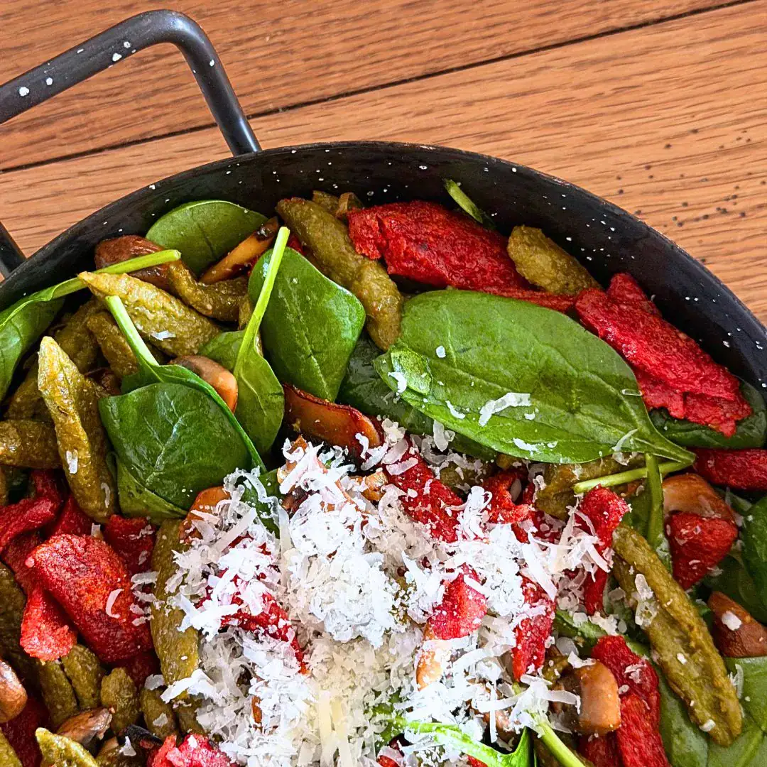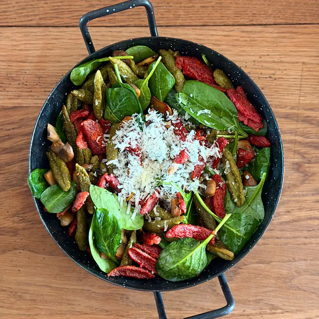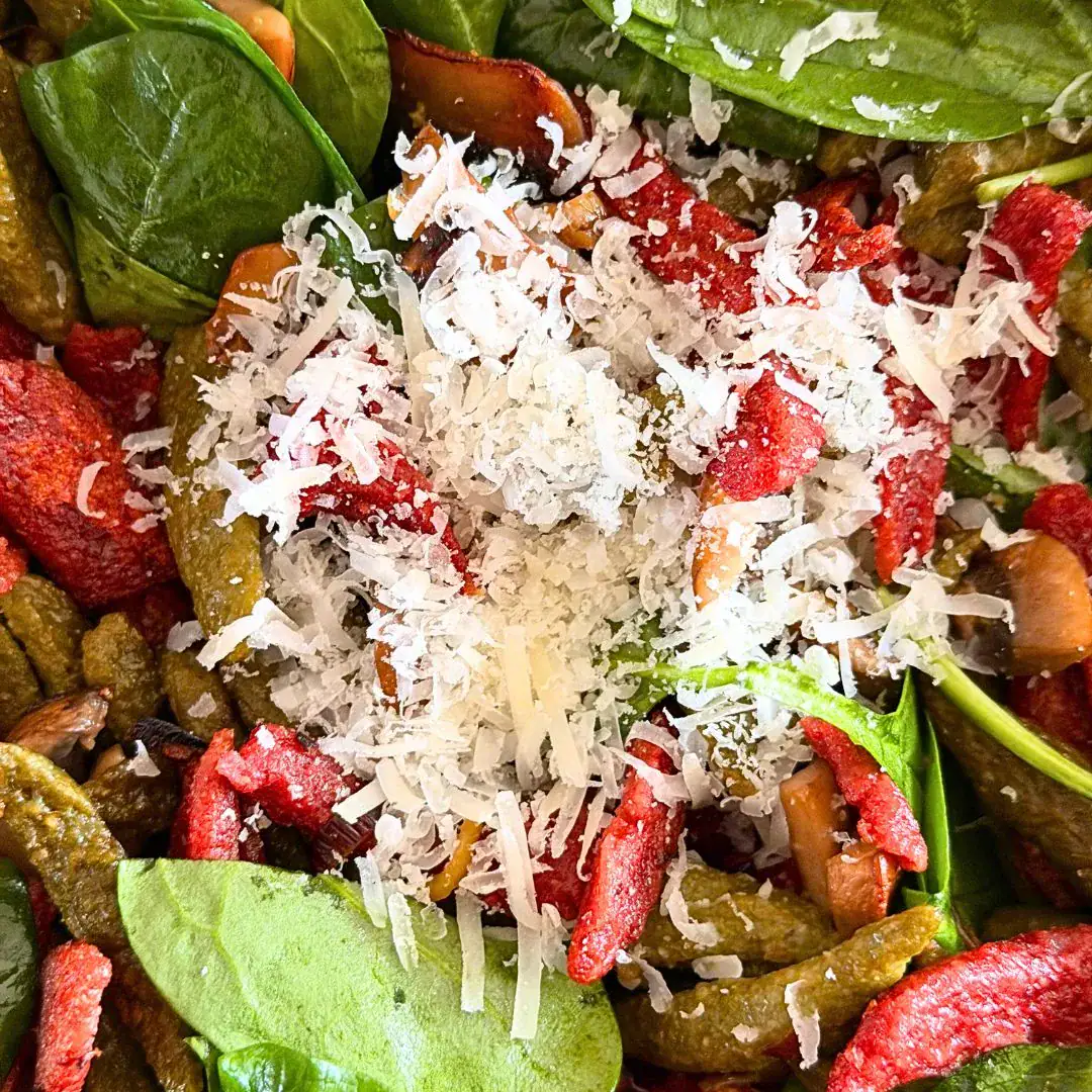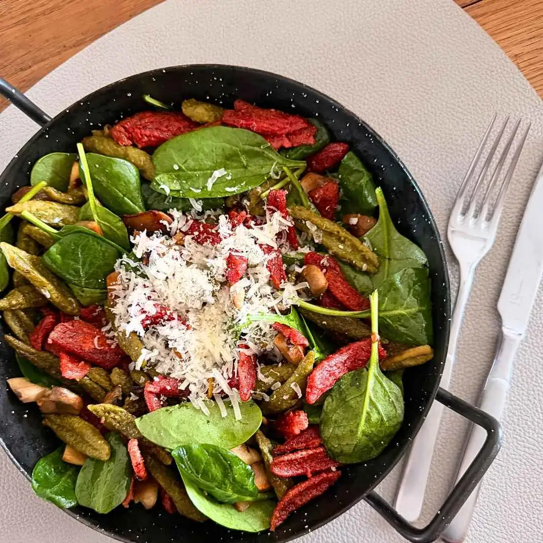 Im Nudelteig sorgt Blattspinat nicht nur für Farbe, sondern auch für Saftigkeit und eine feine, pflanzliche Aromatik. Er macht die Scherennudeln lebendig, nährstoffreich und ausgewogen – ein schönes Beispiel dafür, wie Genuss und Nährwert Hand in Hand gehen können.