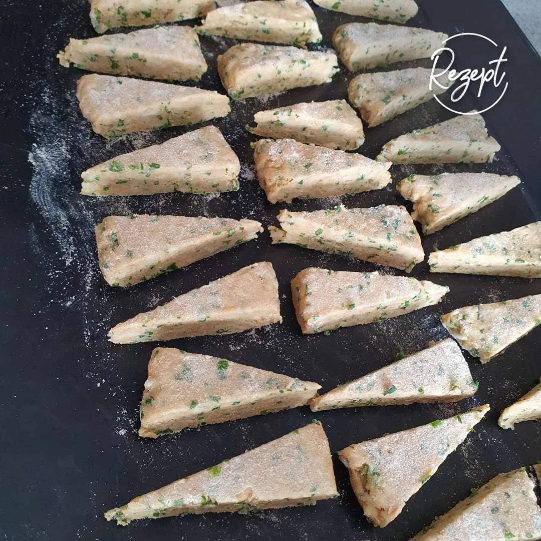 - Das Backblech abgedeckt für ca. 30-60 Minuten ins Gefrierfach stellen. Dadurch lässt sich der Teig besser verarbeiten und die Scones laufen im Ofen nicht breit.
