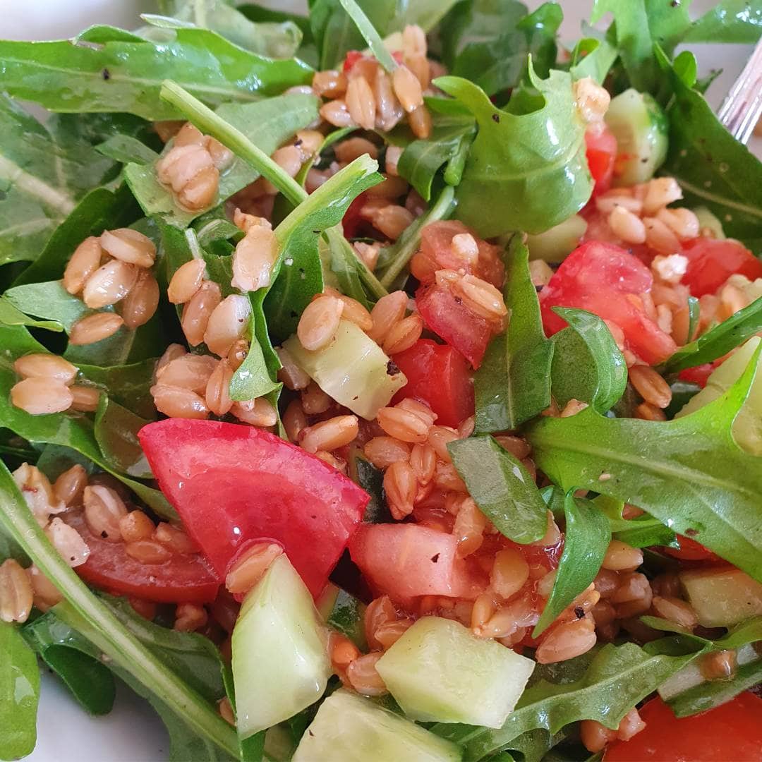 - Tomaten, Gurken und Rucola zum Einkorn in die Salatschüssel geben und durchmischen.