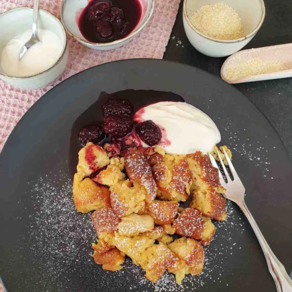 Jetzt, da du einen Einblick in die Entstehung unseres Gerichts hast, laden wir dich ein, mit uns in die Urkorn-Welt einzutauchen. Lass dich von der Einfachheit der Zutaten nicht täuschen – sie verbinden sich zu einem Geschmackserlebnis, das Herzhaftes und Süßes perfekt miteinander verbindet. Hier ist unser Rezept für den leckeren Urmais Polenta-Schmarrn mit verlockender Brombeersoße und frischer Quarkcreme.