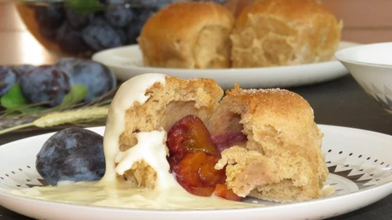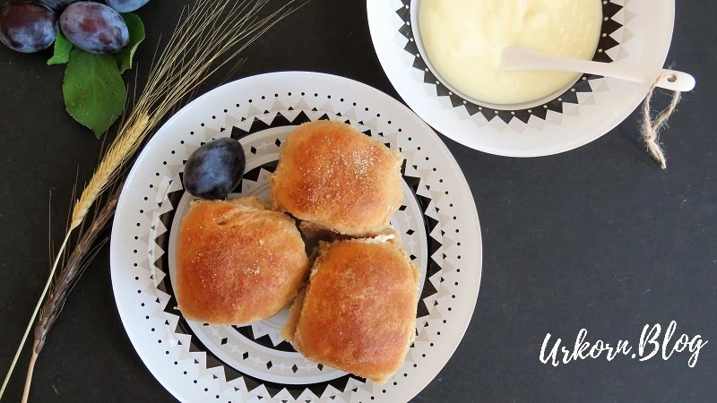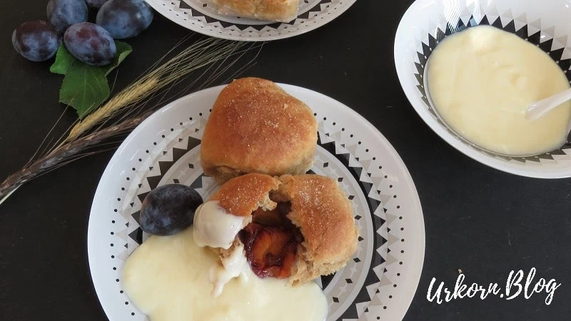 Zwetschgen-Zeit! Eine kleine Zwetschgen-Flut ist diese Woche bei mir angekommen. Frisch vom Baum gepflückt hat mir mein Vater eine rießigen Korb dieser tollen blauen Früchte gebracht. „Einfach mal blaumachen“ hab ich mir gedacht und gleich davon genascht. Das beliebte Steinobst ist schließlich nicht nur lecker, sondern auch sehr gesund und ein wahrer Schatz an gesunden Inhaltsstoffen. Ein süßes und schönmachendes Geschenk der Natur an uns. Mit fast 10 kg dieser blauen Früchte hatte ich nun alle Möglichkeiten diese kreativ zu verarbeiten. So habe ich einen Tag in der Küche verbracht und Zwetschgenmarmelade, Zwetschgenmuß – in Österreich und Bayern als Powidl bekannt, getrocknete Zwetschgen und Zwetschgenkuchen gemacht. Dann bin ich bei einer Tasse Kaffee – natürlich mit Zwetschgenkuchen – auf ein Rezept der Böhmischen Buchteln gestoßen, habe dieses etwas umgebaut und mit Urgetreide und frischen Zwetschgen ausprobiert. Hat super funktioniert, super geschmeckt und passt perfekt in die Kategorie „Vollkorn 2.0 – für Kinder sehr geeignet“
