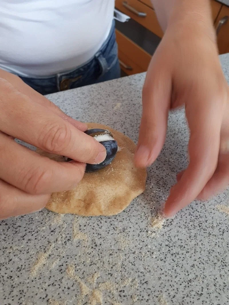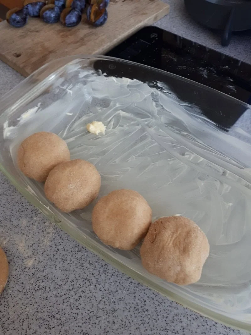 - Kugeln zu ungefähr 1 cm flachen Teigstücken drücken und eine Zwetschge in die Mitte legen