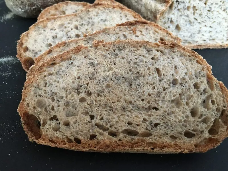 von meinem Urkornexperten-Freund Siggi Brenneis habe ich auf der Südback in Stuttgart sein neues Buch Gesundheitsbewusst backen geschenkt bekommen. Vielen Dank nochmals, lieber Siggi. Er meinte, dass ich die Rezepte – die ja für Bäckereien geschrieben sind – gerne für den Hobbybäcker anpassen und die Rezepte dann für meinen Blog verwenden darf. Am Wochenende habe ich das tolle Buch durchgeblättert und hätte am liebsten gleich 10 Rezepte auf einmal gemacht. Der Blick in meine Vorräte hat dies etwas relativiert und ich bin beim Chia-Brot hängen geblieben. Ich habe das Rezept allerdings etwas vereinfacht und ein zusätzliches Kochstück weggelassen. Außerdem habe ich den gepoppten Emmer den ich nicht hatte durch Flohsamenschale ersetzt. Die Hälfte des verwendeten Dinkelmehls Typ 630 habe ich durch BlueVelvet Vollkornmehl ersetzt. Ach ja, und die Bioland Dinkelkraft habe ich ebenfalls wegen Ermangelung desselben weggelassen. Aber ansonsten habe ich alles so gelassen.