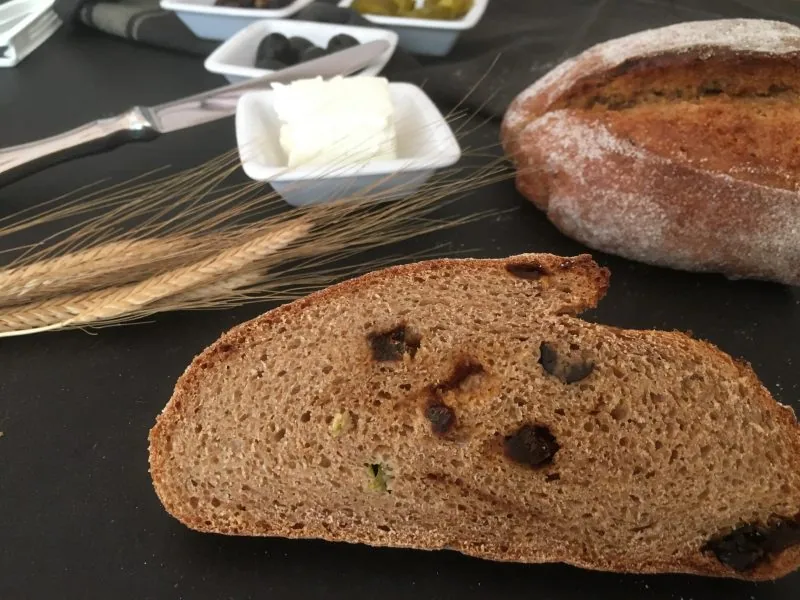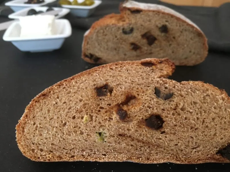- getrocknete Tomaten, Oliven und Jalapenos zugeben und 2-3 Minuten unterkneten