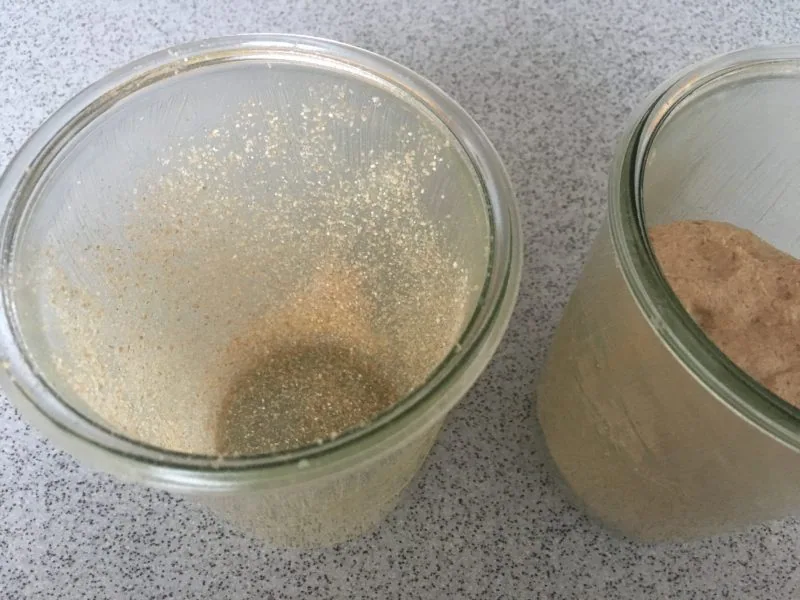 - oder du gibst den Teig direkt in das Glas und lässt ihn im Kühlschrank gehen. Dann solltest du allerdings spätestens nach 12 – 18 Stunden backen, sonst bekommt der Teig „Übergare“ und fällt wieder in sich zusammen