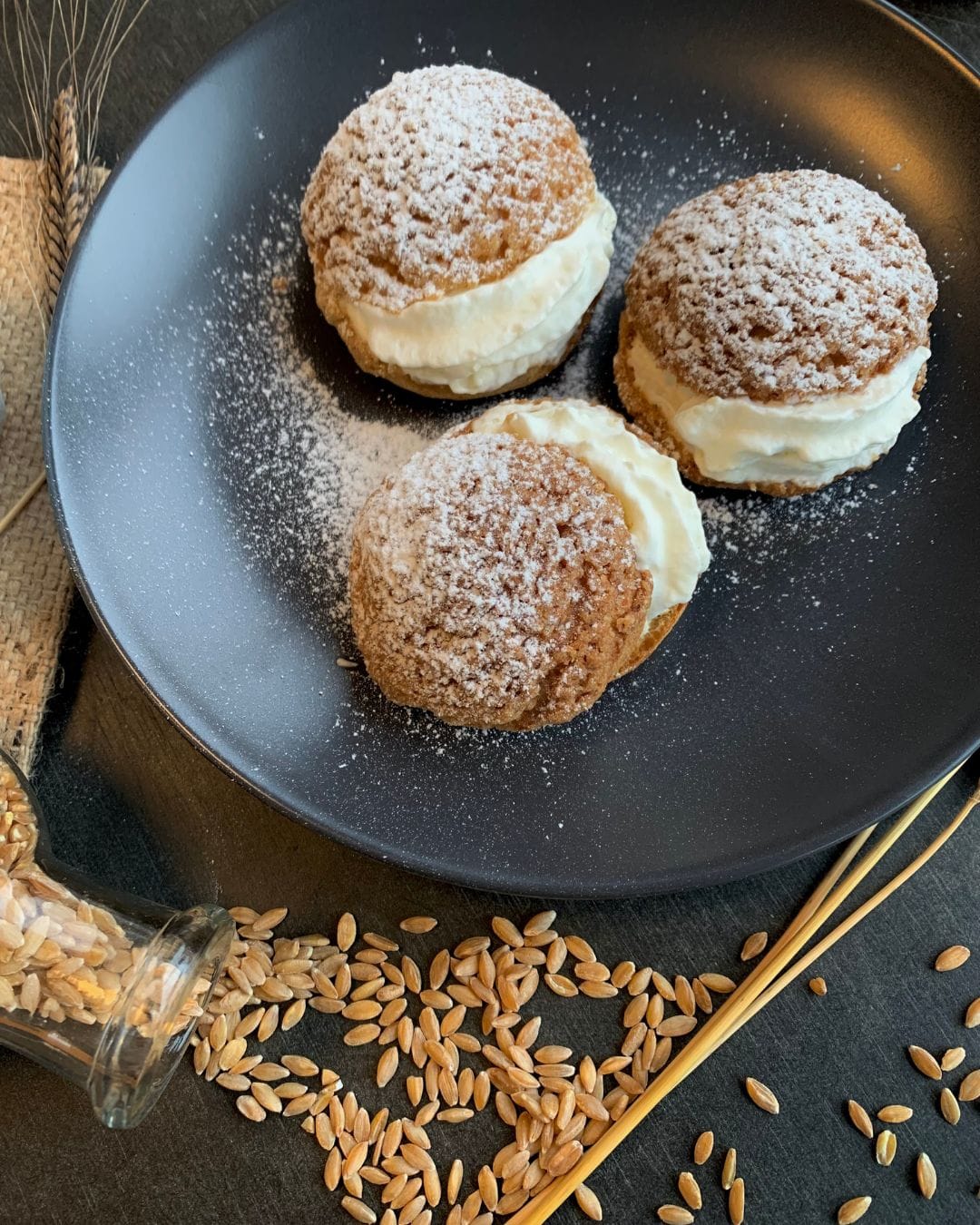 Die Entscheidung, auf Weißmehl zu verzichten und stattdessen Einkorn Vollkornmehl zu verwenden, bereichert die Windbeutel mit Zuckerhaube zusätzlich mit einem leicht nussigen Geschmack. Durch die feine Pulverisierung des Mehls bleibt die Konsistenz der Miniwindbeutel luftig und leicht und verspricht mit jedem Bissen Genuss pur!