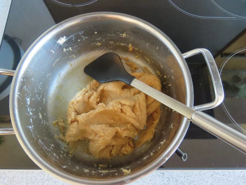 - Rühre die Masse so lange, bis ein homogener Teigklumpen entsteht und sich auf dem Topfboden eine weiße Schicht bildet.