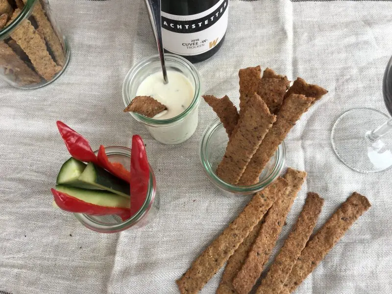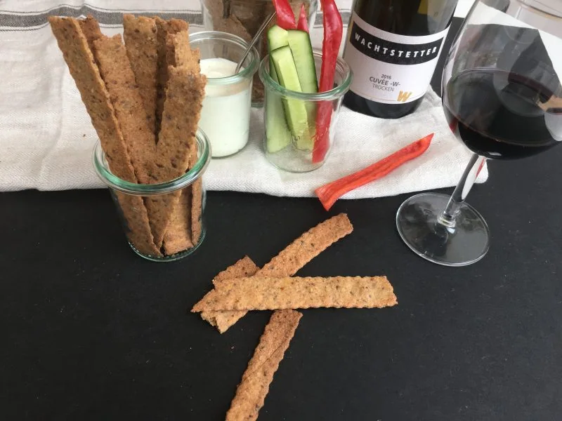 Ein Filmeabend ohne Knabberzeug ist wie waschen ohne Seife – es fehlt einfach etwas! Was gibt es Gemütlicheres, als mit einem Glas Wein und einer Tüte Chips einen spannenden Krimi anzuschauen. (Rosamunde Pilcher geht ab und zu auch)…. mit den Chips habe ich allerdings mit zunehmendem Alter Probleme. Nicht weil sie unglaublich ungesund sind (ein Handvoll, ab und zu und bewusst geknabbert bringt niemanden um) sondern weil ich nach einem Chipsabend tatsächlich ein Unwohlsein verspüre. Selbst am nächsten Morgen hab ich noch ein ungutes Gefühl im Magen, bereue jeden Bissen und nehme mir vor, das nächste Mal auf die Chips zu verzichten. Aber ein Krimi so ganz ohne dieses würzige knabbern ist irgendwie auch blöd. Weil Not bekanntlich erfinderisch macht, sind diese urigen Knabberstangen entstanden. Diese Knusperstangen sind echt genial. Ich mache ein Grundrezept und kann ganz einfach verschiedene Geschmacksrichtungen herstellen. Sie werden vor dem Backen noch mit Öl bestrichen. Das Öl würze ich ganz nach Belieben. Mal scharf mit Paprika und Chili oder mit Knoblauch, mal mit mediteranem Kräutersalz oder mit Gemüsewürze – der Kreativität sind hier keine Grenzen gesetzt. Die Knusperstangen lagere ich in großen Weck-Gläsern, was in der Küche auch als hübsche Deko fungiert. Der Nachteil dabei ist allerdings, dass die Stangen meist nicht bis zum nächsten Film reichen und es in einen Familienkrimi mit dem Titel: „wer hat die letzte Stange geknuspert“ ausartet.