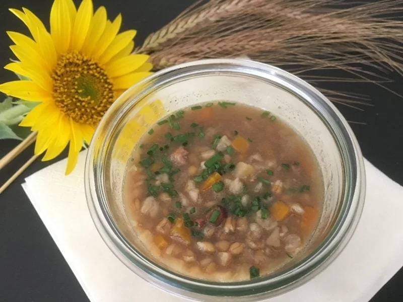 Herbstzeit – Suppenzeit. Für die Dreharbeiten von ARD Buffet hatte ich im Sommer verschiedene Emmergerichte präsentiert. Unter Anderem  auch diese leckere Emmersuppe. Die Zuppa di Farro ist ein typisch italienisches Gericht, welches ich bereits vor 3 Jahren zum ersten Mal gekocht habe. Damals sollte ich für ein Event über 70 Leute mit einem typischen Urkornessen versorgen. Beim ersten Mal Probekochen war es nicht wirklich überzeugend und meine Familie und ich hatten Mühe bis alles gegessen war….. Ich habe mich dann an einen Koch aus der Sterneküche gewandt, der mir gerne ein paar Tipps zur Suppen-Optimierung gab. Mit nur wenigen kleinen Änderungen wurde die Suppe beim 2. Mal wirklich sehr lecker und wurde von den Gästen komplett aufgegessen. Schon damals fragten viele nach dem Rezept dieser würzigen, kräftigen und sättigenden Suppe. Die Suppe eignet sich besonders gut, wenn du viele Gäste erwartest, die nicht alle zum gleichen Zeitpunkt essen. Dann ist diese Zuppa al Farro eine wirklich entspannte Sache. Du bereitest sie vor und hältst sie in einem großen Topf warm (ich hatte damals einen großen Eindünstkessel). So kann sich jeder selbst bedienen und du hast viel Zeit, dich mit deinen Gästen zu unterhalten und den Abend zu genießen.