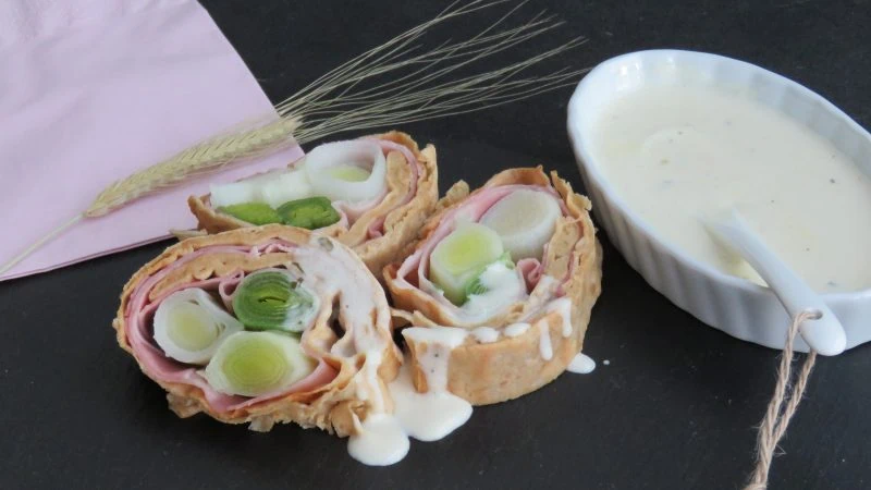 Einkorn-Pfannkuchenroulade mit Lauch