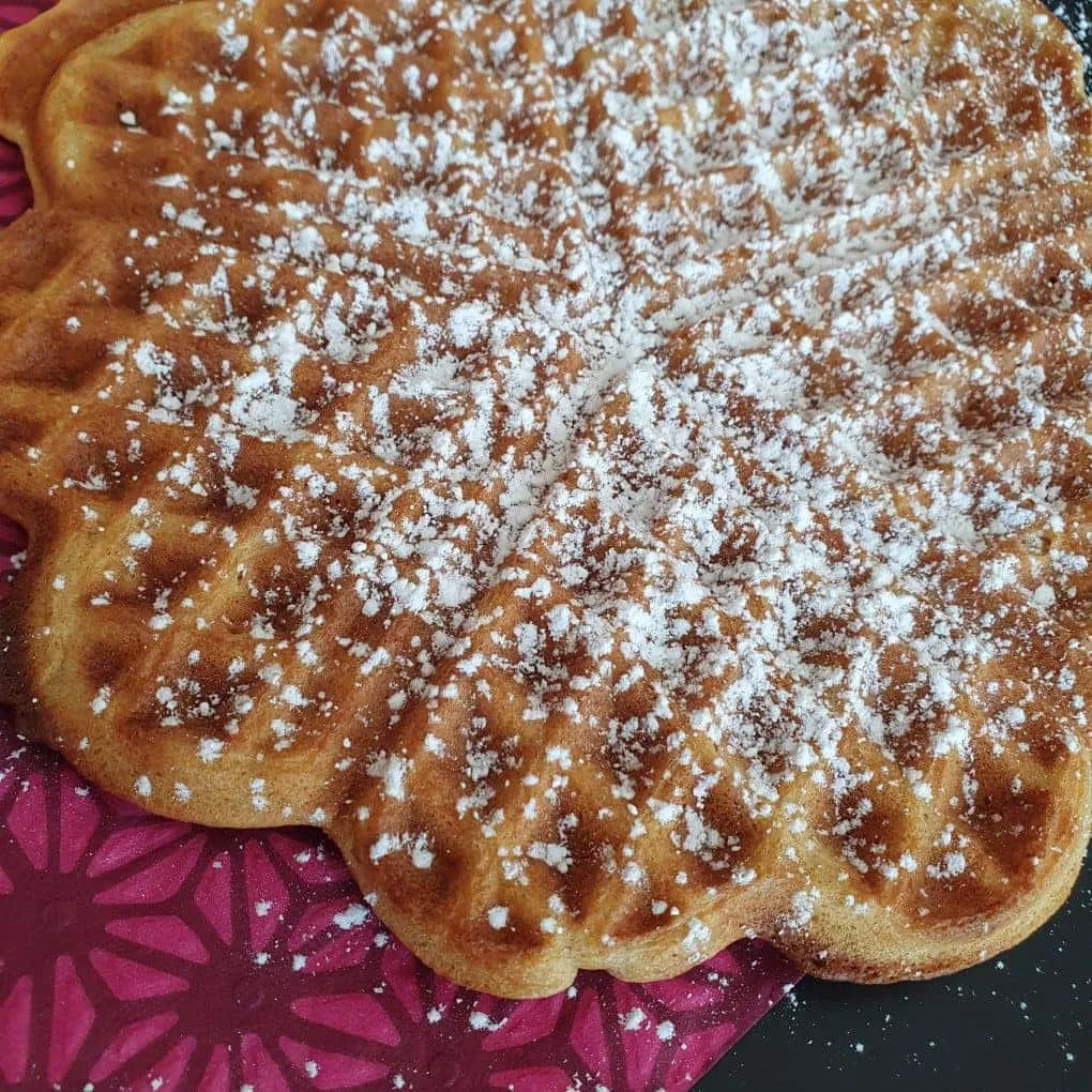 - Bestäube die Urkornwaffeln mit Puderzucker und serviere sie.